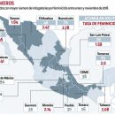 Respecto a la medición del delito de acuerdo a la tasa por cada 100 mil mujeres, Colima encabeza en feminicidios a nivel nacional con 3.11%; le siguen Nuevo León (2.78%); Chihuahua (2.47%); Sinaloa (2.45%) y Zacatecas (2.41%).
