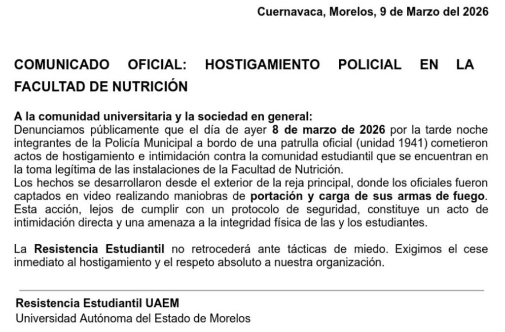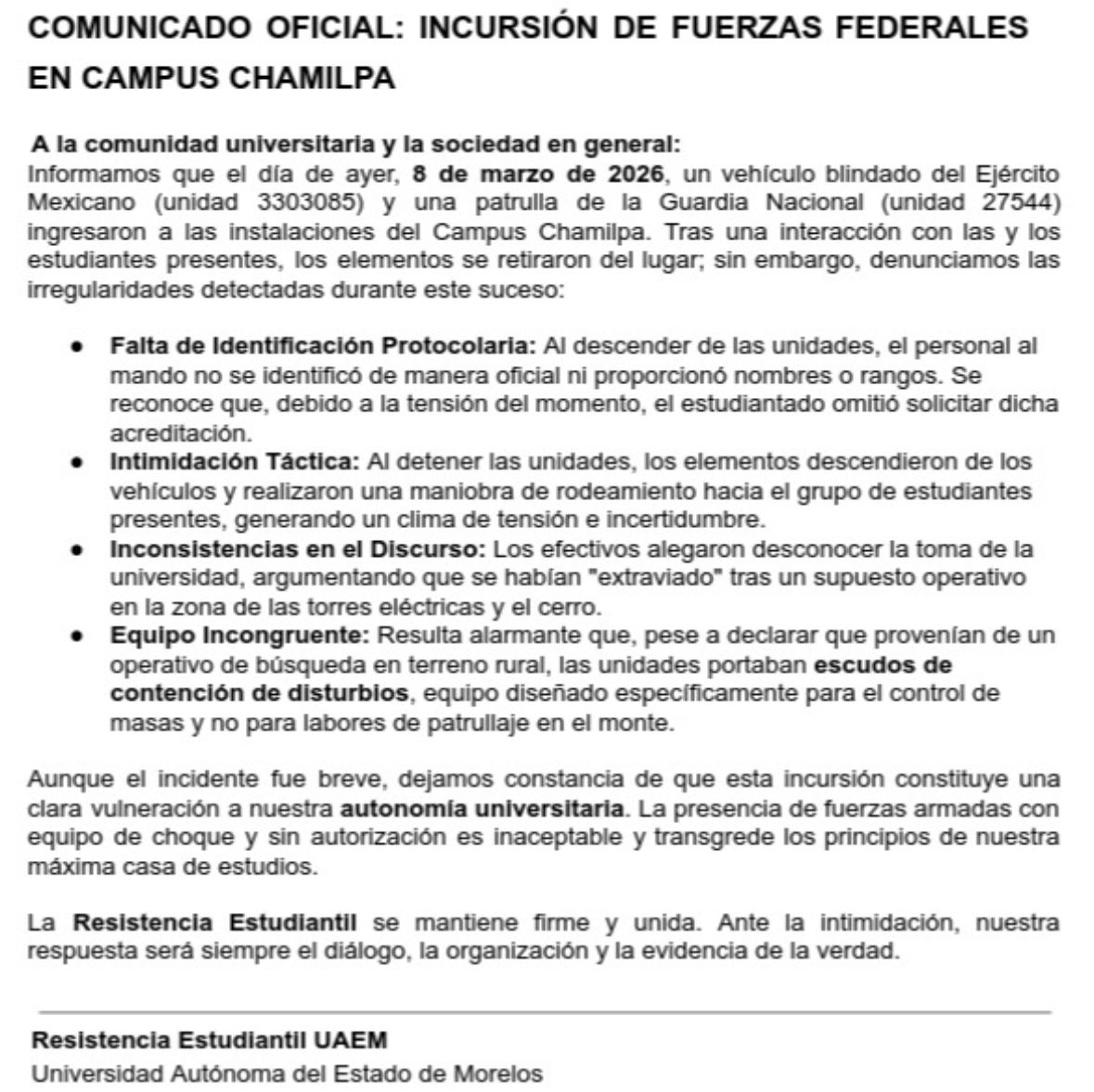 El día de ayer, 8 de marzo de 2026, un vehículo del Ejercito mexicano y una patrulla de la Guardia Nacional ingresaron al Campus Chamilpa en Cuernavaca de la Universidad Autónoma del Estado de Morelos (UAEM). Al acercarse al punto de guardia que mantienen estudiantes cerca de uno de los accesos al plantel, soldados y miembros de Guardia Nacional armados con armas largas, descendieron de sus vehículos y rodearon a los estudiantes, denunciaron éstos a través de un comunicado. Los soldados argumentaron que se habían extraviado durante un operativo en la zona de las torres eléctricas y el cerro. Sin embargo, los estudiantes señalan la inconsistencia de dicha información dado que los elementos de la Guardia Nacional iban equipados con escudos de contención de disturbios.